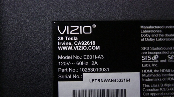 Vizio 60" LED TV Power Supply Board: 09-60CAP000-00, RKE601I01, 1P-1127800-1010, E601I-A3, E601I-A3, E601I-A3, E601I-A3, E601I-A3, E601I-A3E