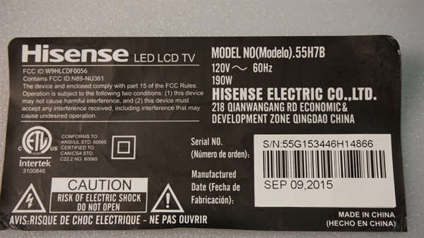 THIS PART WAS PULLED FROM HISENSE 55" LED MODEL # 55H7B.