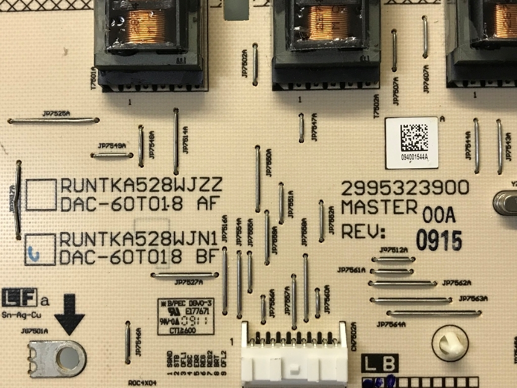 2995323900, RUNTKA528WJN1, RUNTKA528WJZZ, DAC-60T018, LC-52D85UN, LC-52BD80U, LC-52E77U, LC-52E77UN, LC-52SB57U, LC-52SB57UN, LC-C5277UN, SHARP 52 LCD TV INVERTER BOARD