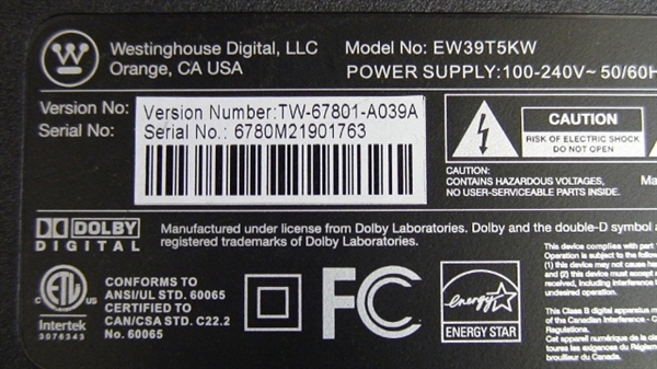 THIS PART WAS PULLED FROM WESTINGHOUSE 39" LED TV, MODEL # EW39T5KW, TW-67801-A039A, UNIT WORKING COMPATIBLE ALL MODEL # BELOW.
