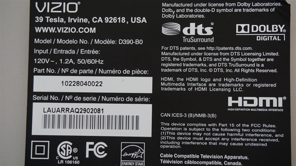 THIS PART WAS PULLED FROM VIZIO 39" LED TV, MODEL # D390-B0.