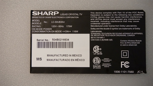 THIS PART WAS PULLED FROM SHARP 50" LED MODEL # LC-50UB30U.