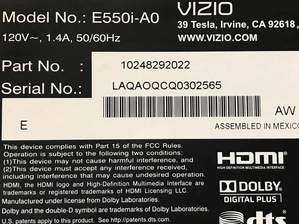 THIS PART WAS PULLED FROM VIZIO 55" LED TV MODEL # E550I-A0.
