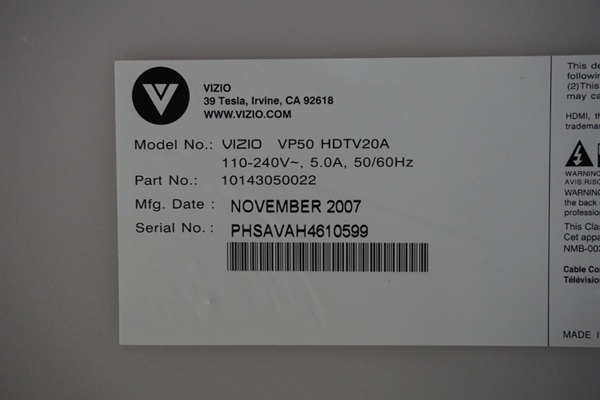 THIS PART WAS PULLED FROM VIZIO 50" PLASMA TV TV MODEL # VP50 HDTV20A.