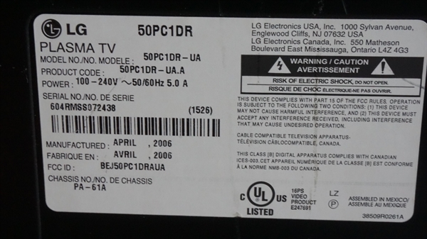 50PC1DR, 50PC1DR-UA, 50PC1DR-UA.A, LG 50 PLASMA TV 720P, 50PC1DR LG 50 TV 720P