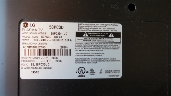 THIS PART WAS PULLED FROM LG 50" PLASMA TV MODEL # 50PC3D-UD, UNIT WORKING COMPATIBLE ALL MODEL # BELOW.