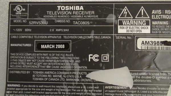 THIS PART PULLED FROM 52" TOSHIBA LCD TV, MODEL # 52RV530U, CHASSIS # TAC0805, UNIT WORKING COMPATIBLE ALL MODEL # BELOW.