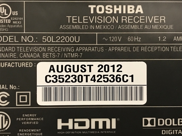 THIS PART WAS PULLED FROM TOSHIBA 50" LED TV, MODEL # 50L2200U.