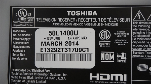 THIS PART WAS PULLED FROM TOSHIBA 50" LED TV MODEL # 50L1400U.