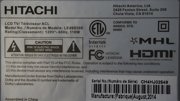 THIS PART WAS PULLED FROM HITACHI 49" LED TV, MODEL # LE49S508.