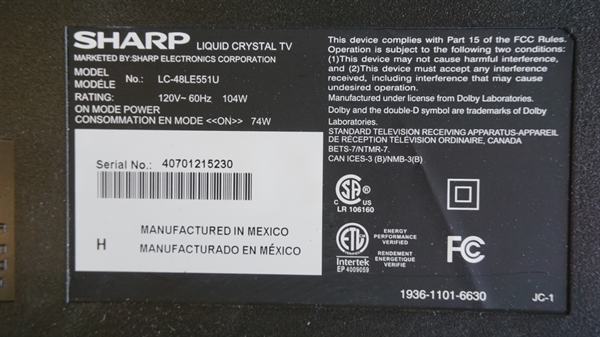 THIS PART WAS PULLED FROM SHARP 48" LED TV, MODEL # LC-48LE551U.