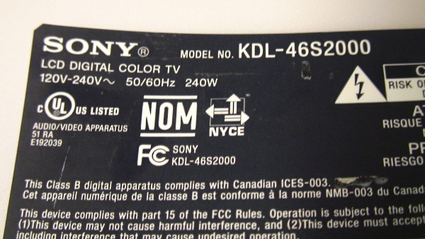 Manufacturer part number: A-1169-591-H, A-1169-591-C, A-1169-591-A, A-1169-591-D, A-1169-591-E, A-1169-591-F, 1-869-027-13, 1-869-027-12, A-1144-543-E, A-1189-958-A, A-1169-591-B, KDL-46S2000