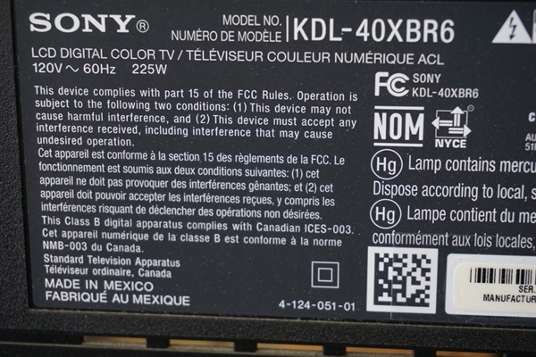 Manufacturer part number: A-1558-231-A, A1558230A, A-1558-230-A, KDL-40XBR6
