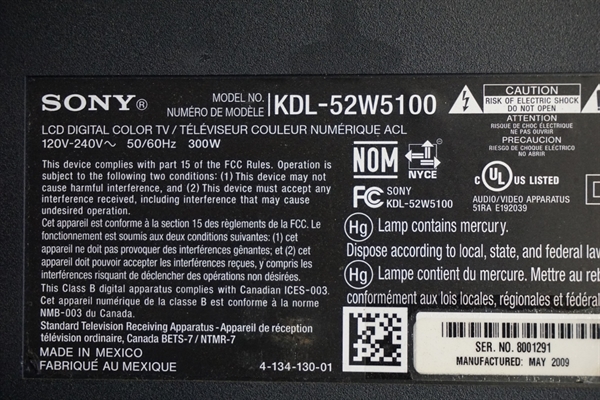 Manufacturer part number: A-1734-658-A, A-1734-659-A, A-1671-683-A, 1-879-224-14, A1671682B, KDL-52W5100
