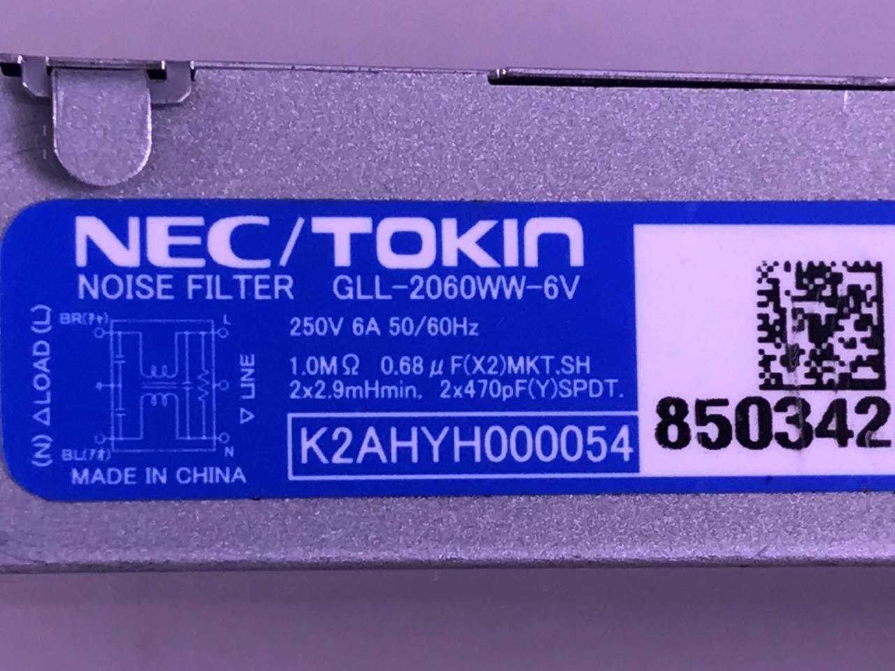 Manufacturer part number: K2AHYH000054, GLL-2060WW-6V, 250/6A, 50/60Hz, NEC/TOKIN