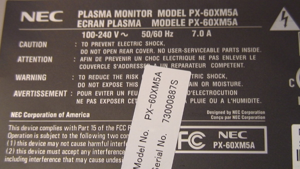 THIS PART WAS PULLED FROM NEC 60" PLASMA TV MODEL # PX-60XM5A.