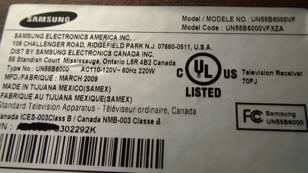 Manufacturer part number: BN63-01369A, BN96-09468C, B9C09SJ, UN55B6000VF, UN55B6000VFXZA