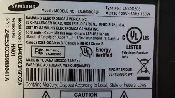 Manufacturer part number: BN94-04845T, BN41-01704A, BN97-05822T, LN40D503, LN40D503F6