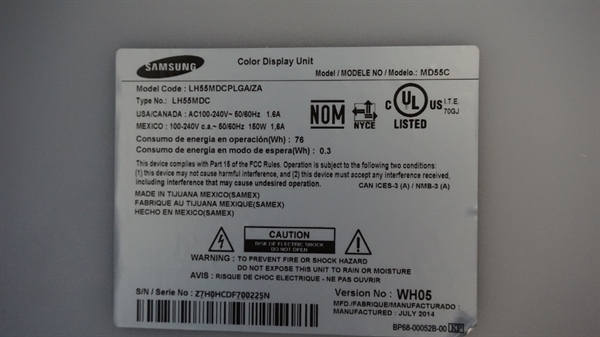 Manufacturer part number: BN94-06748V, BN97-07682D, BN41-02004B, LH55MDCPLGA/ZA