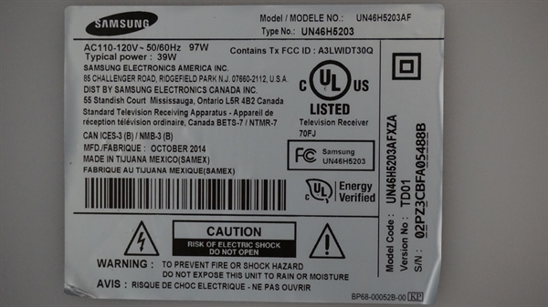 Manufacturer part number: BN94-07741C, BN97-08781E, BN41-02245A, UN46H5203AFXZA