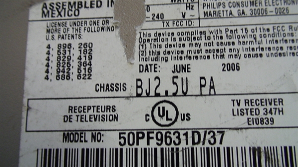 THIS PARTS WE PULLED FROM WORKING 50" PHILIPS PLASMA MODEL # 50PF9631D/37, CHASSIS # BJ2.5UPA, WE CHECKED AND TESTED ALL FUNCTION BEFORE PUT ON HDTVPARTS STORE.