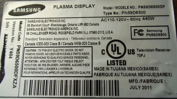 BN96-16539A, LJ41-09456A, LJ92-01783A, PN59D6500DF, PN59D550C1FXZA, PN59D6500DFXZA, PN59D7000FFXZA, PN59D8000FFXZA, PN64D8000FFXZA, SAMSUNG 59 PLASMA TV