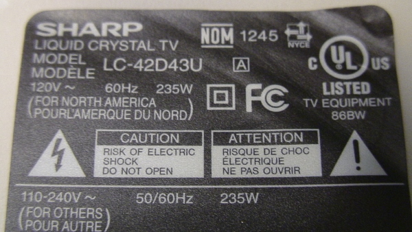THIS PART PULLED FROM 42" SHARP LCD, MODEL # LC-42D43U, UNIT WORKING COMPATIBLE ALL MODEL # BELOW.