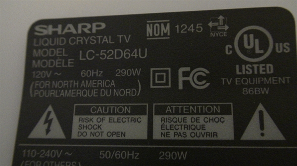 THIS PART PULLED FROM WORKING SHARP 52" LCD MODEL# LC-52D64U, UNIT WORKING COMPATIBLE ALL MODEL # BELOW.