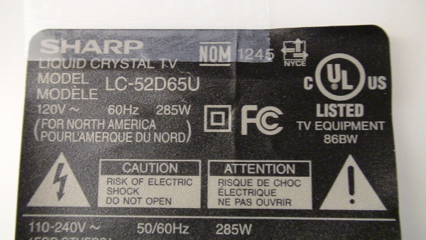 THIS PART PULLED FROM WORKING 52" SHARP LCD MODEL # LC-52D85U, UNIT WORKING COMPATIBLE ALL MODEL # BELOW.