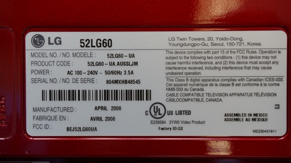 THIS PART WAS PULLED FROM LG 52" LCD TV, MODEL # VR-4085DF.