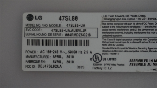 THIS PART WAS PULLED FROM DAMAGED LG 50" LCD TV, MODEL # 47SL85, 47SL85-UA, 47SL85-UA.AUSVLJR.