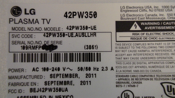 THIS PART WAS PULLED FROM WORKING 42" LG PLASMA TV, MODEL # 42PW350, SVC CODE: 42PW350-UE.AUSLLHR, UNIT WORKING COMPATIBLE ALL MODEL # BELOW.