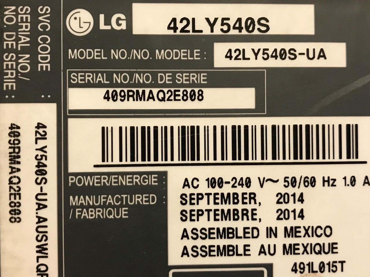 THIS PART WAS PULLED FROM LG 42" LED TV MODEL # 42LY540S-UA.
