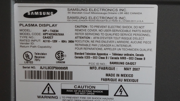 HP-T4234, HP-T4234X/XAA, SAMSUNG 42 PLASMA TV 720P, SAMSUNG 42 PLASMA TV, TV