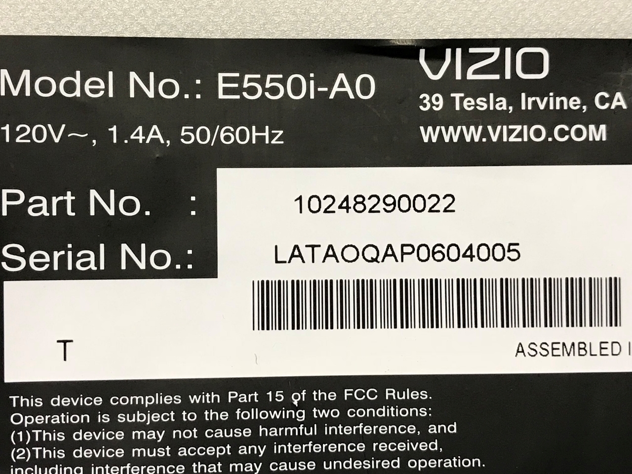 THIS PART WAS PULLED FROM VIZIO 55" LED TV, MODEL # E550I-A0.