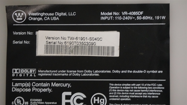 THIS PART WAS PULLED FROM WESTINGHOUSE 40" LCD TV, MODEL # VR-4085DF.