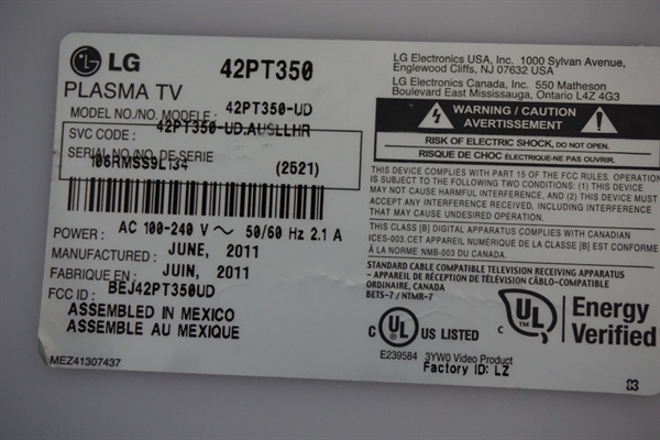 THIS PART WAS PULLED FROM WORKING 42" LG PLASMA TV, MODEL # 42PT350-UD, UNIT WORKING COMPATIBLE ALL MODEL # BELOW.