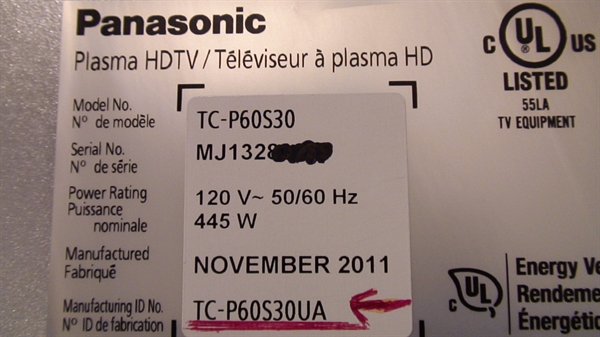 THIS PART PULLED FROM WORKING PANASONIC 60" PLASMA TV, MODEL # TC-P60S30, AND MANUFACTURING ID # TC-P60S30UA.