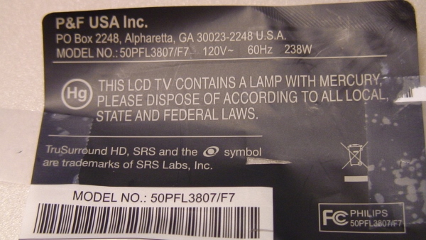 - Philips 50" LCD TV Main Board Model # 50PFL3807/F7