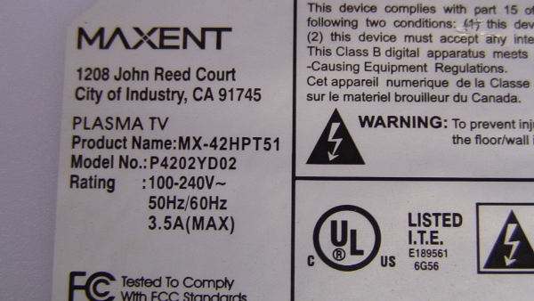 THIS PART PULLED FROM WORKING 42" MAXENT TV, MODEL # P4202YD02, PRODUCT NAME: MX-42HPT51.
