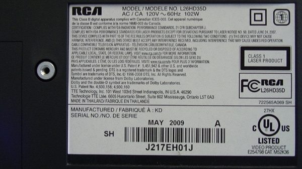 Manufacturer part number: RCA 26 LCD TV DVD COMBO, L26HD35D