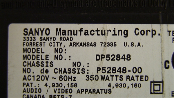 THIS PARTS WE PULLED FROM SANYO 52" LCD, MODEL # DP52848, AND CHASSIS # P52848-00, WE CHECKED AND TESTED ALL FUNCTION BEFORE PUT ON HDTVPARTS STORE.