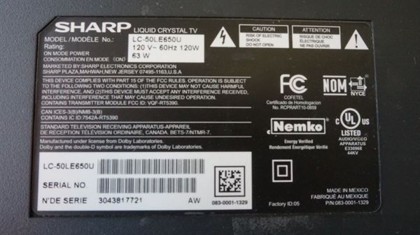 THIS PART WAS PULLED FROM SHARP 50" LED TV MODEL # LC-50LE650U.