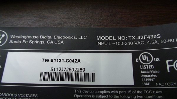 THIS PART PULLED FROM WORKING 42" WESTINGHOUSE LCD, MODEL # TX-42F430S.