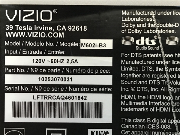 THIS PART WAS PULLED FROM VIZIO 60" LED TV, MODEL # M602I-B3.