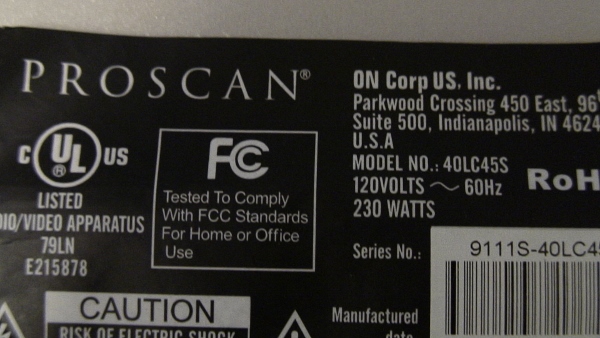 THIS PART PULLED FROM WORKING PROSCAN 40" LCD TV MODEL # 40LC45S.